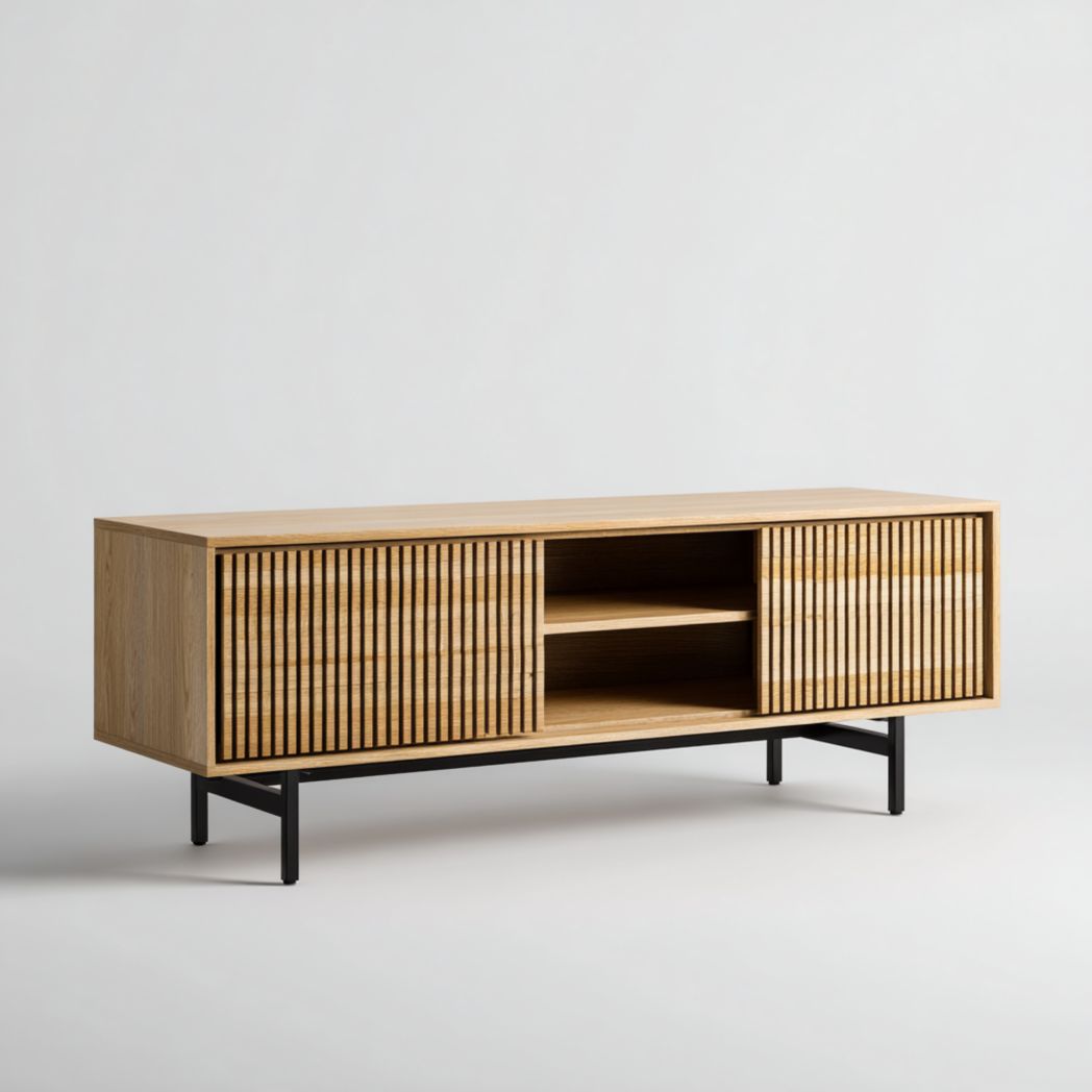 Buffet bas en chêne clair avec portes rainurées et piétement en métal noir€206,55Describe your product