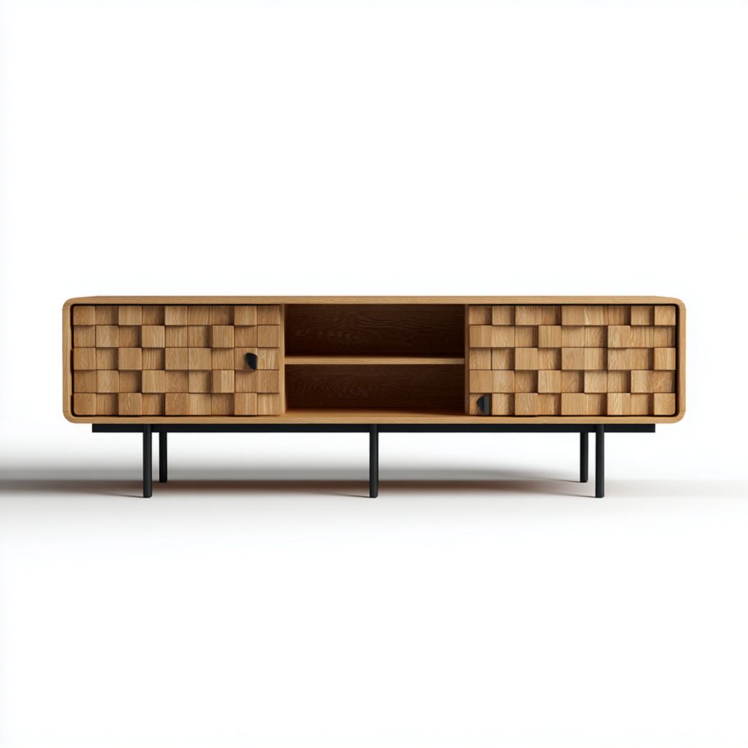 Meuble TV en bois de chêne avec portes sculptées et pieds en métal noir€161,55Describe your product
